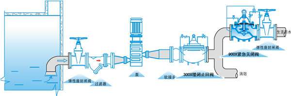 900X紧急关闭阀用于生活供水和消防供水并联供水系统中,正常情况供生活用水,当火灾发生时消防用水时,阀门自动关闭生活用水,确保足够的消防用水。当消防停止用水时压力减少,阀门自动恢复生活用水,该阀使系统无须另设专门的消防单独供水管网,大大地节省了工程建设成本和日常的用水量。该阀控制灵敏、可靠、调试简单、使用寿命长。